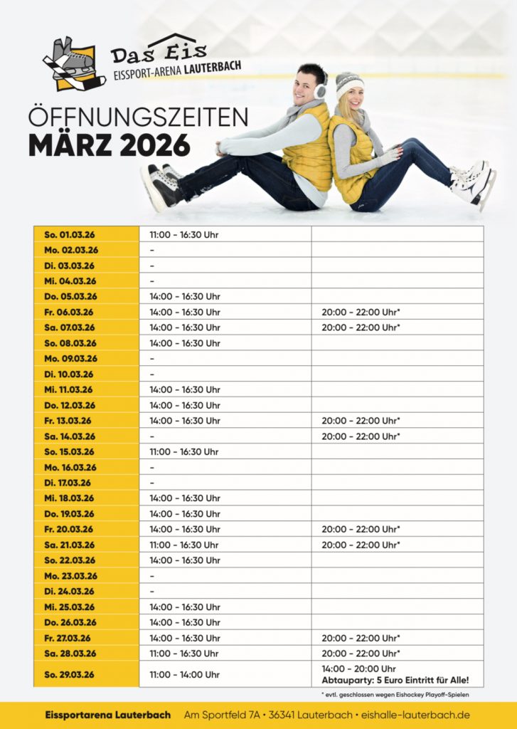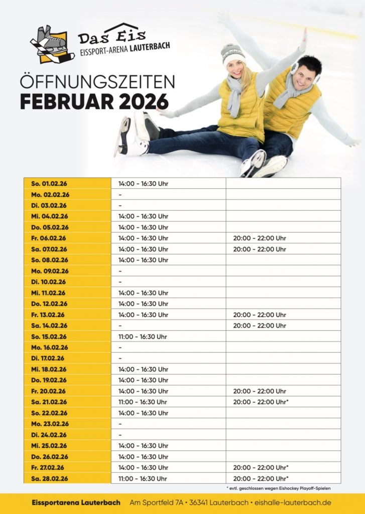 Die Eissport-Arena Lauterbach hat wieder regelmäßig ihre Türen für alle großen und kleinen Eislauffans geöffnet. Ob Familienausflug, sportliches Training oder gemütliches Gleiten über das Eis – wir freuen uns auf Ihren Besuch.
